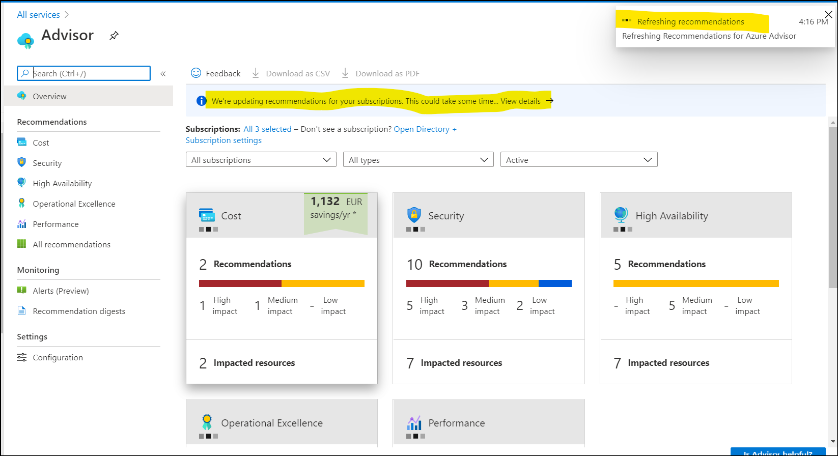 The Advisor dashboard is displayed & automatically scans your Azure configuration and recommends changes to optimize deployments, increase security, and save you money. Wait untill the recommandations are updated.