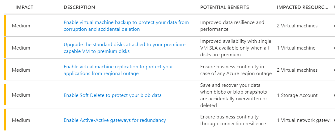 High Availability recommendation helps you ensure and improve the continuity of your business-critical applications. Advisor identifies virtual machines that are not part of an availability set and recommends moving them into an availability set, identifies availability sets that contain a single virtual machine and recommends adding one or more virtual machines to it and many more.